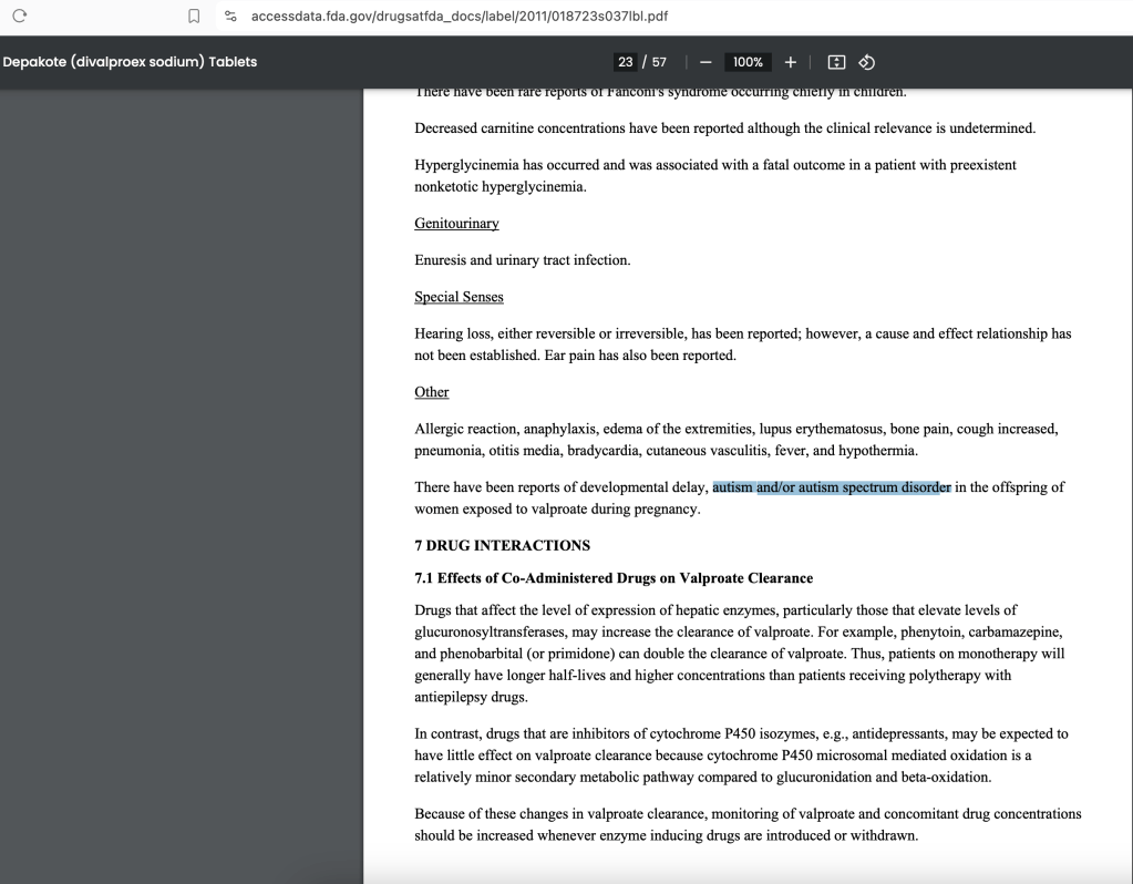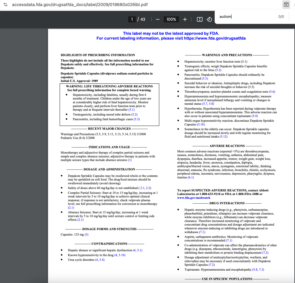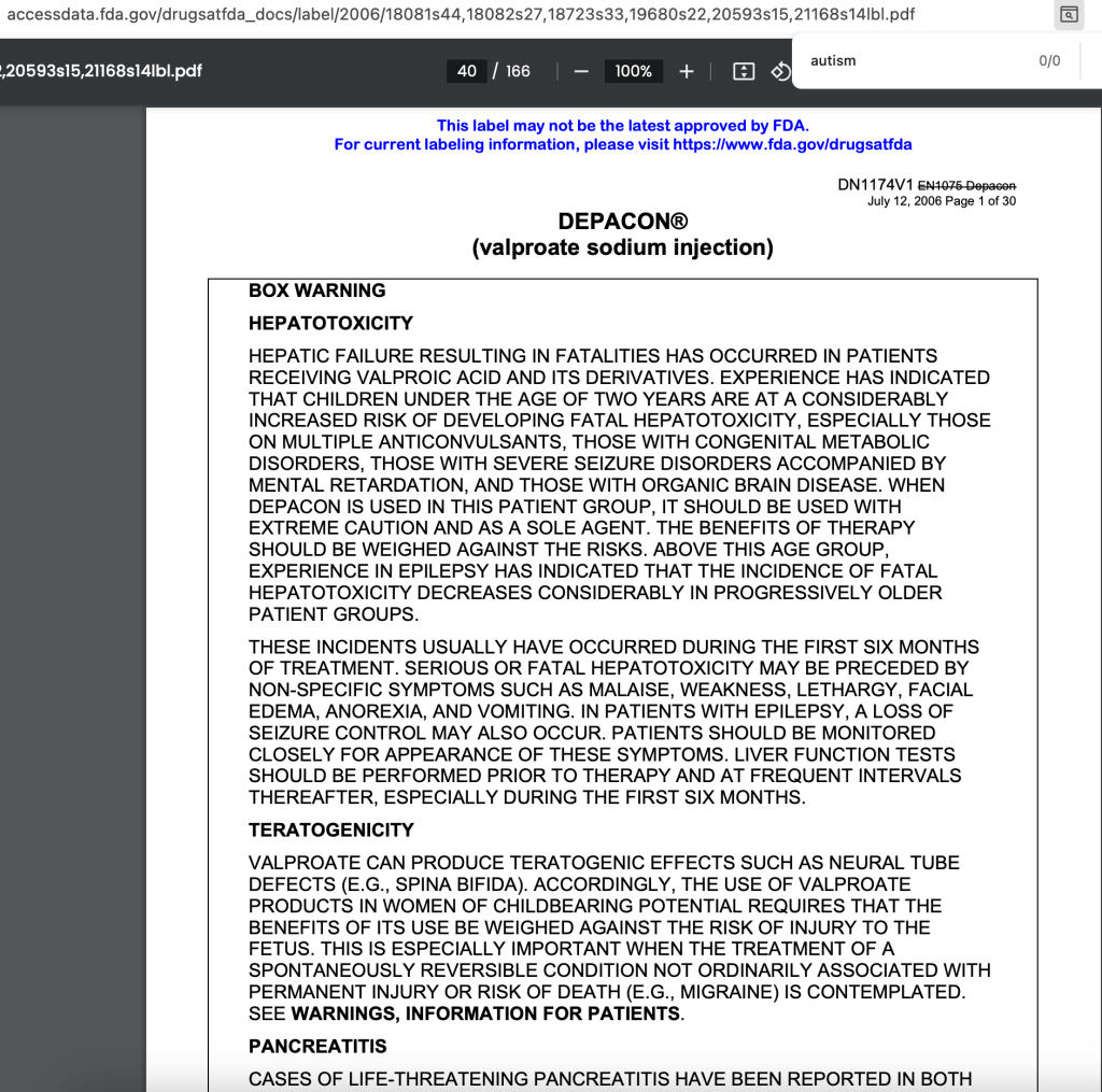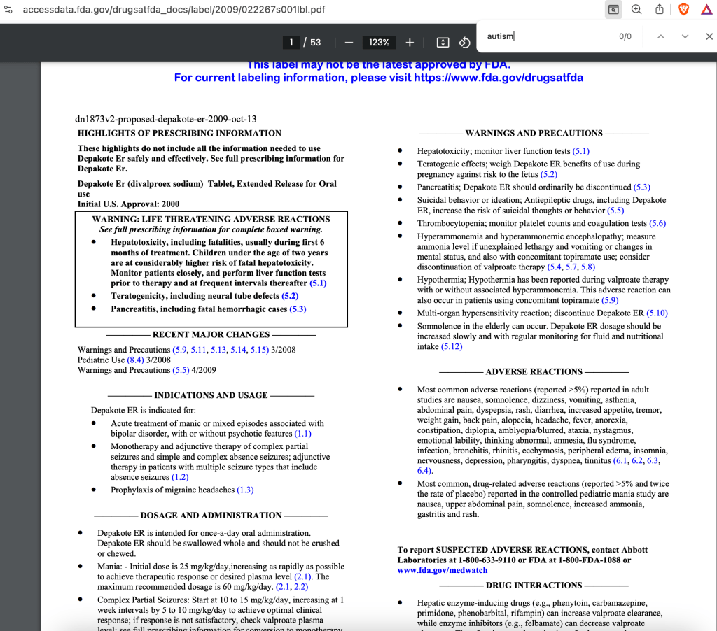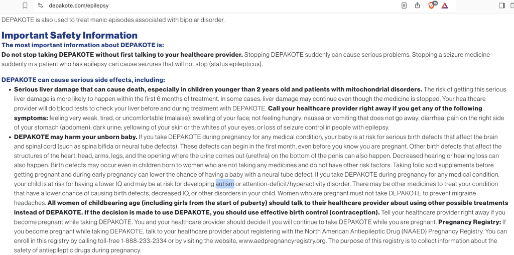 June 2024 Discovery: Depakote online website lists ‘autism’ as a consequence for offspring of pregnant mothers exposed to the drug during pregnancy.