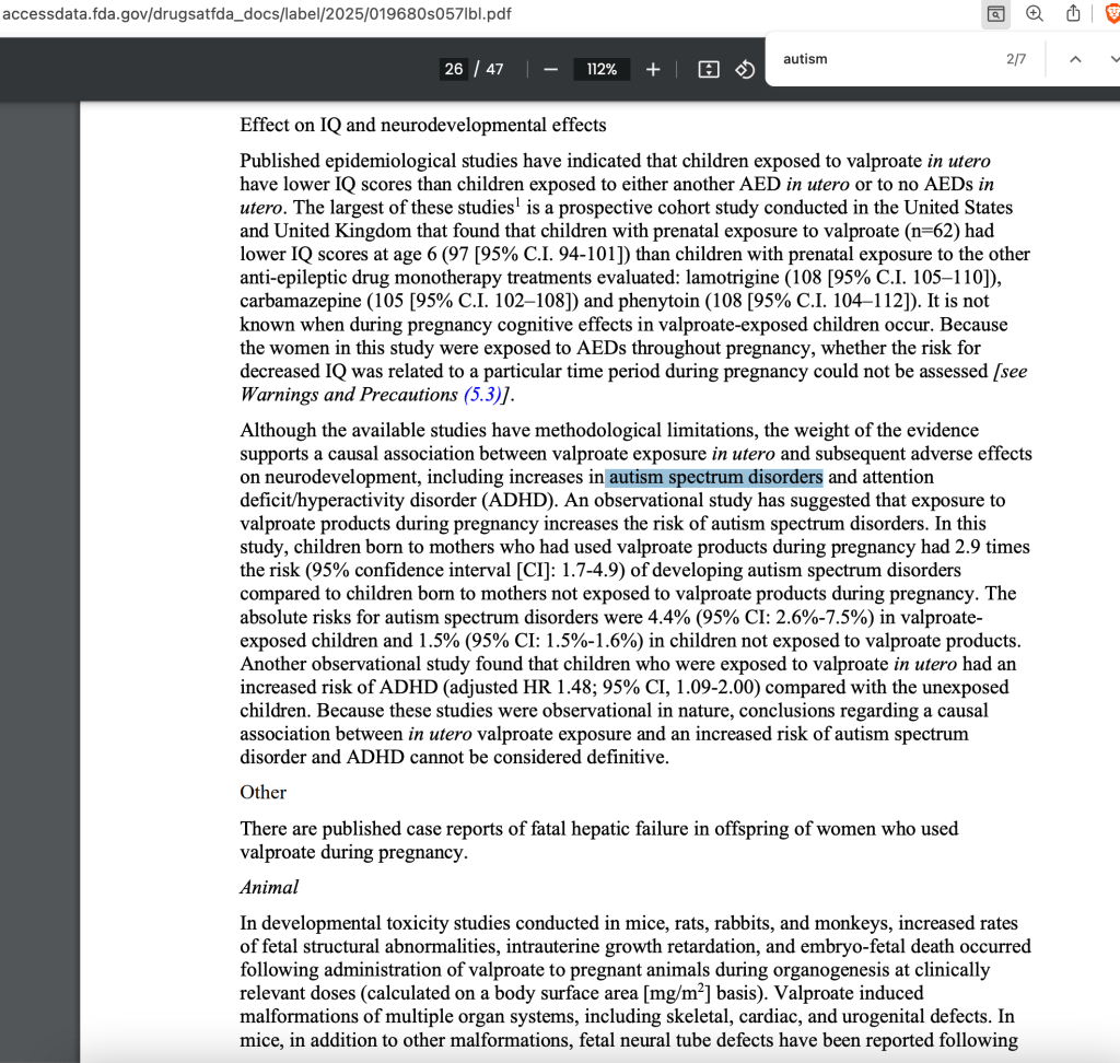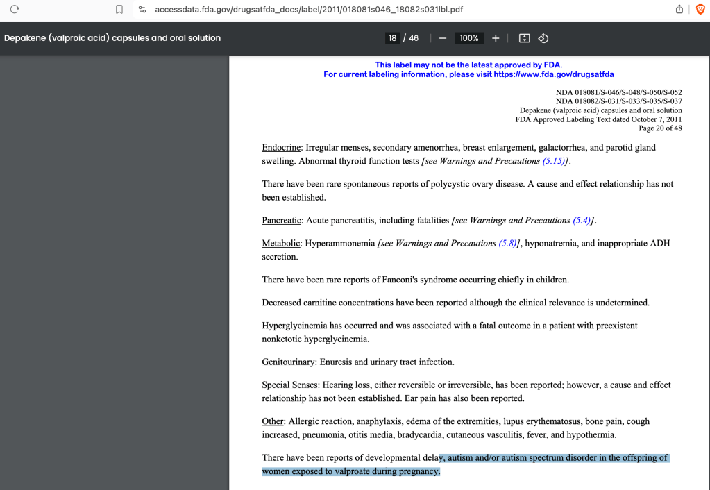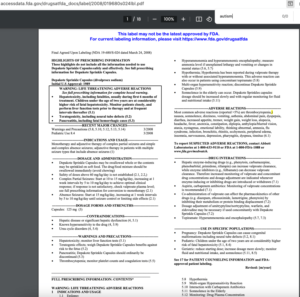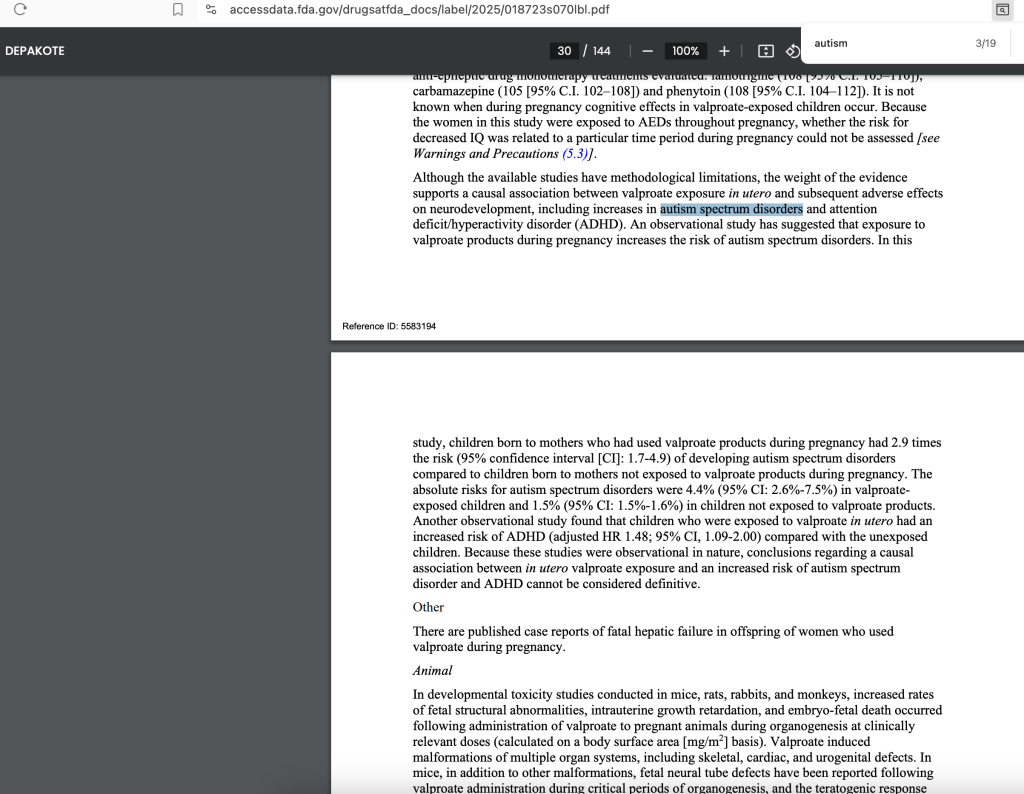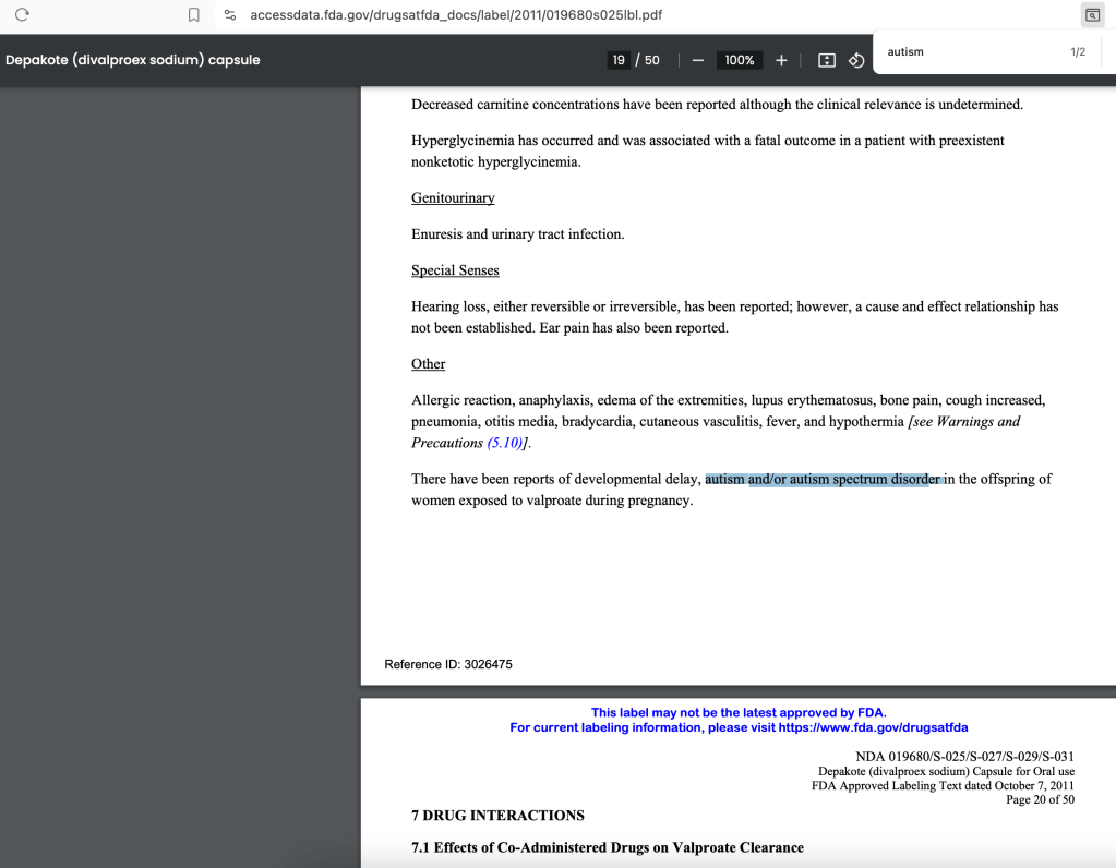 June 2024 Discovery: Depakote online website lists ‘autism’ as a consequence for offspring of pregnant mothers exposed to the drug during pregnancy.