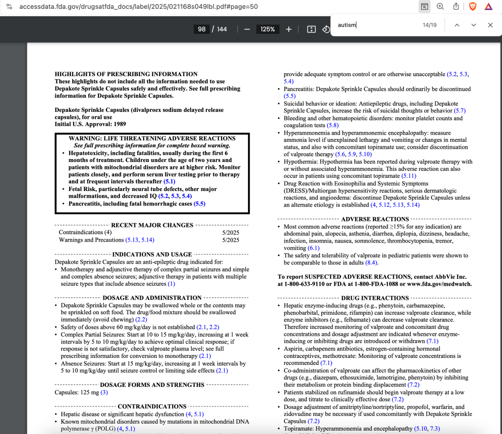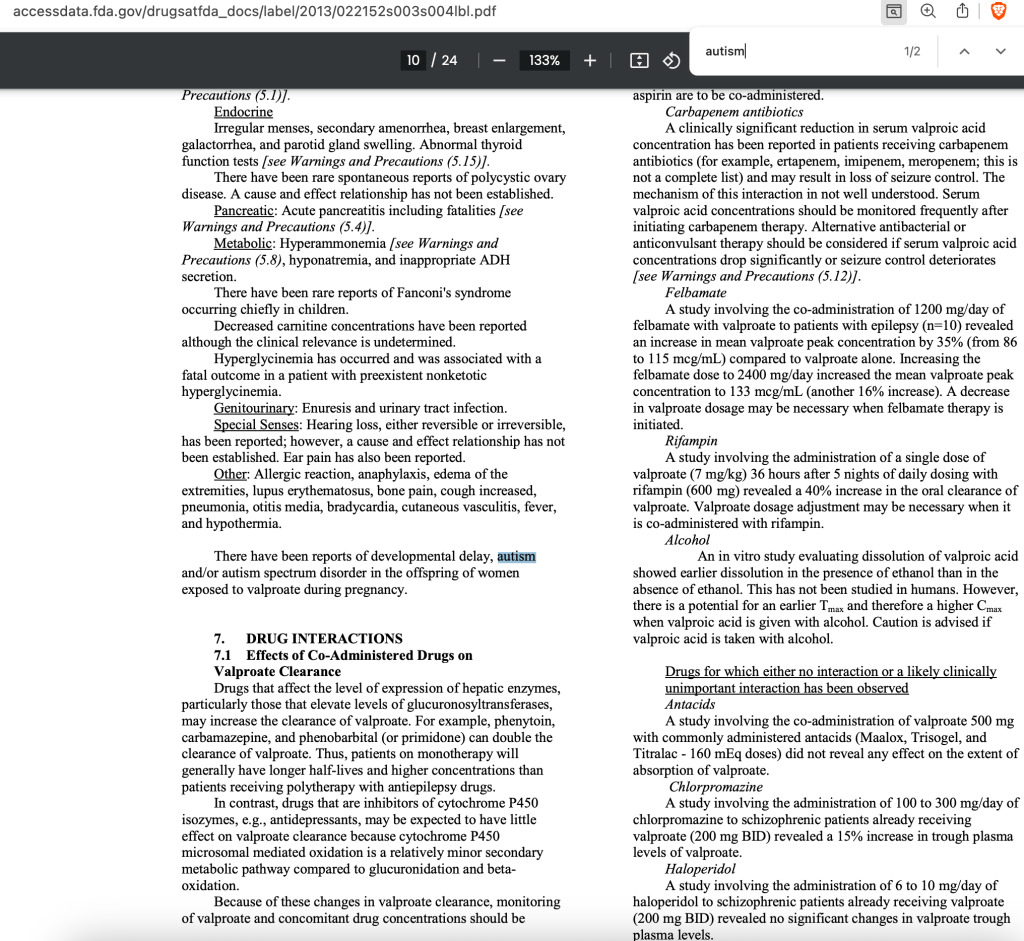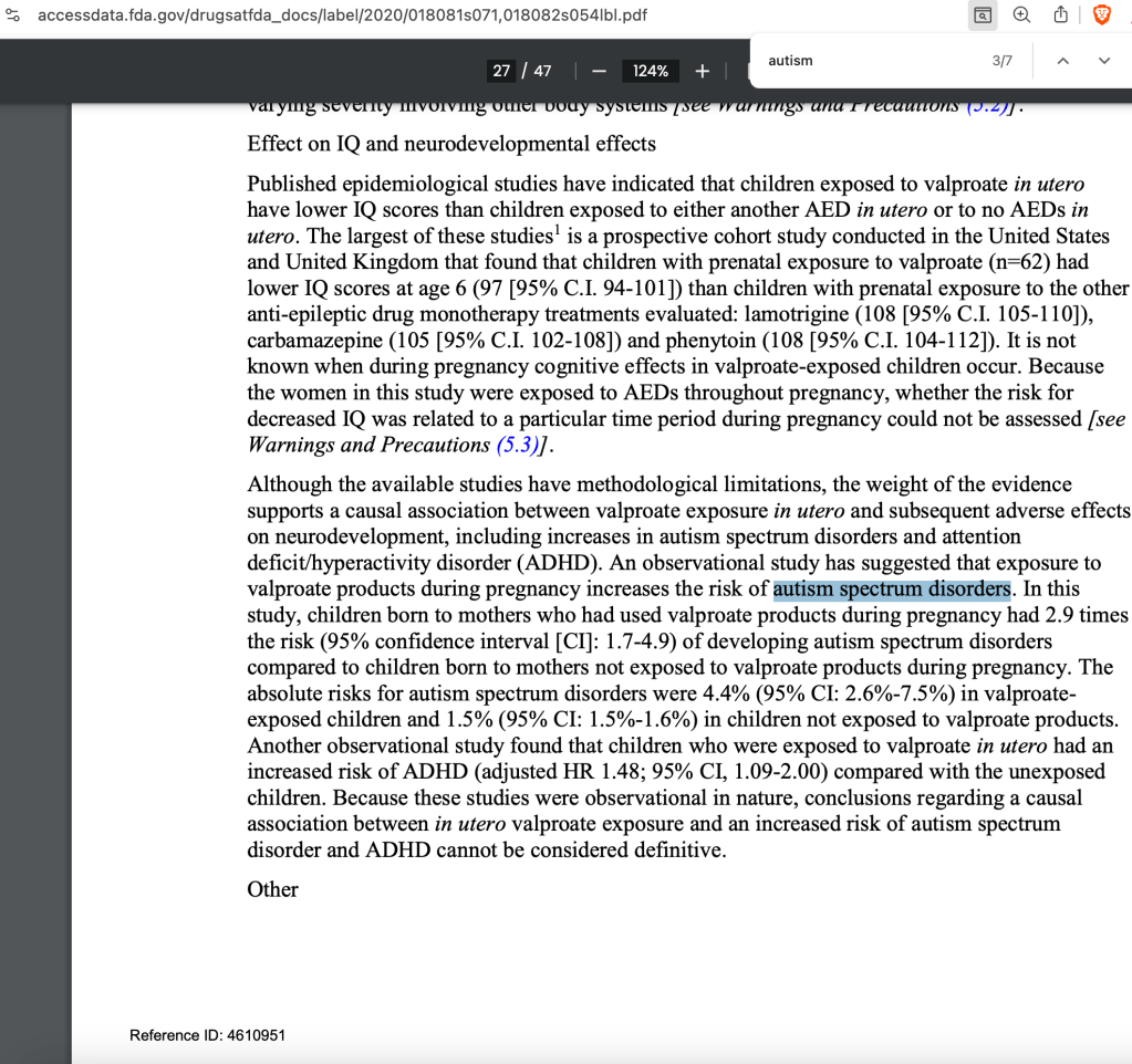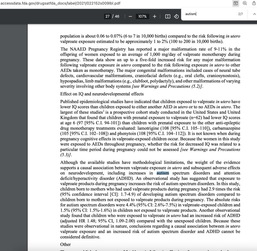 June 2024 Discovery: Depakote online website lists ‘autism’ as a consequence for offspring of pregnant mothers exposed to the drug during pregnancy.