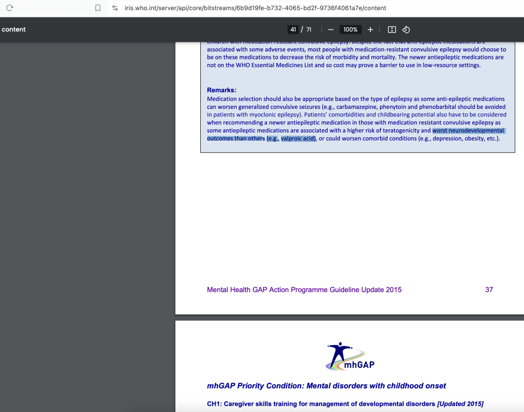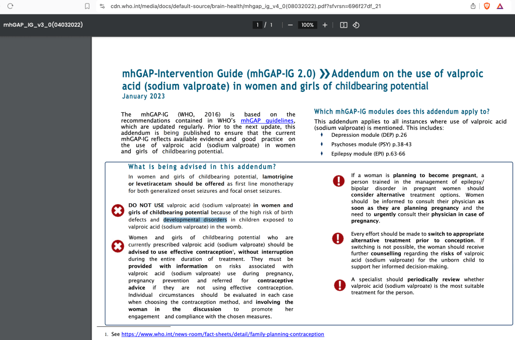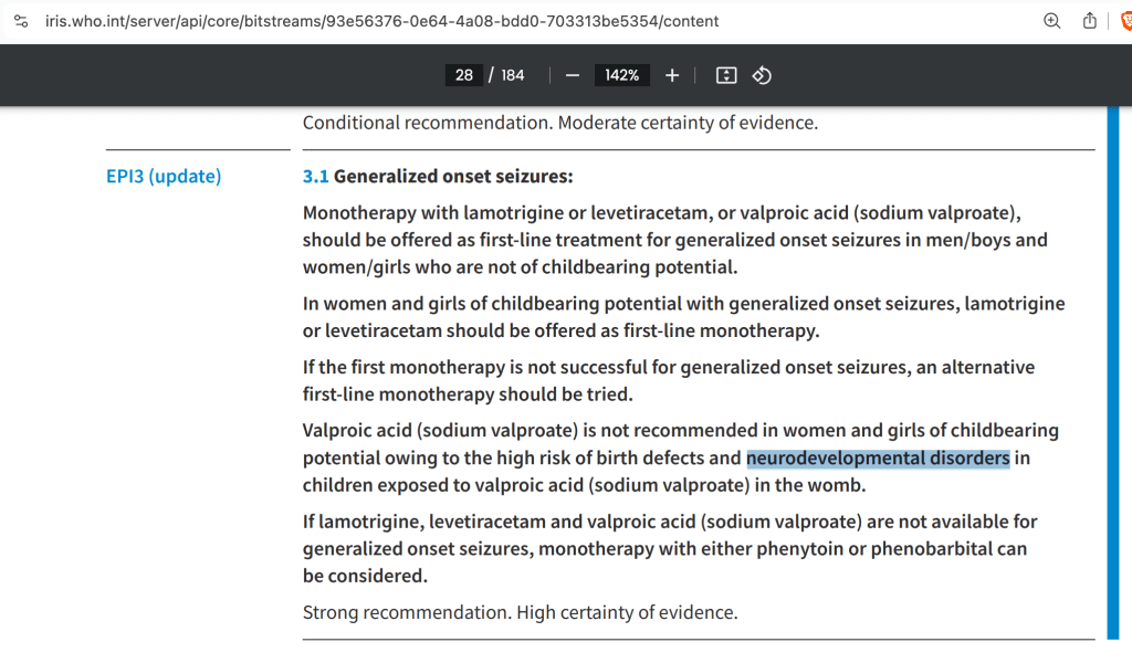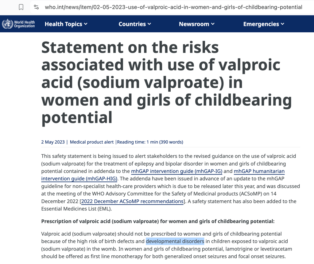 On June 16, 2025 I published Trump’s Executive Order: Is Exiting the WHO the Right Thing to Do (for Autism)? highlighting several key documents where the WHO specifically warns against valproate use by woman of childbearing potential due to developmental effects on children.